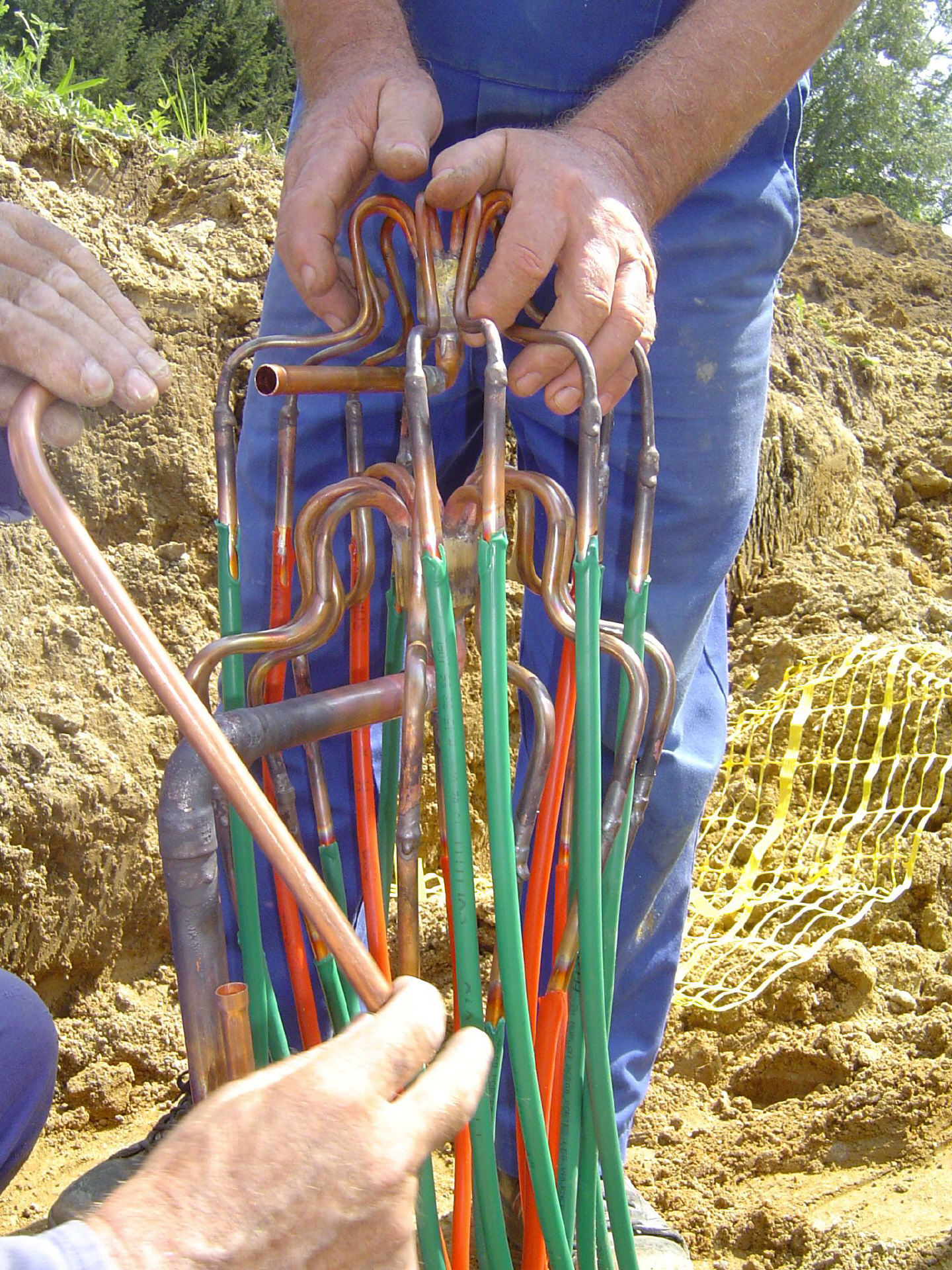 Bei der Direktverdampfung verdampft das Arbeitsmittel der Wärmepumpe in Hart- PVC ummantelten Kupferrohren und entzieht dabei dem Erdreich Wärme-Energie. Es sind weder Soleumwälzpumpen noch Zwischenwärmetauscher nötig. Der Verdichter übernimmt, dabei den Arbeitsmittel Transport.